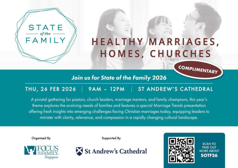 Gathering February 26 @ 9:00 am - 12:00 pm State of the Family 2026 – Healthy Marriages, Homes, Churches “Come Away, My Beloved”-Woman’s Gathering in Singapore | 12th-14th March 2026 View details